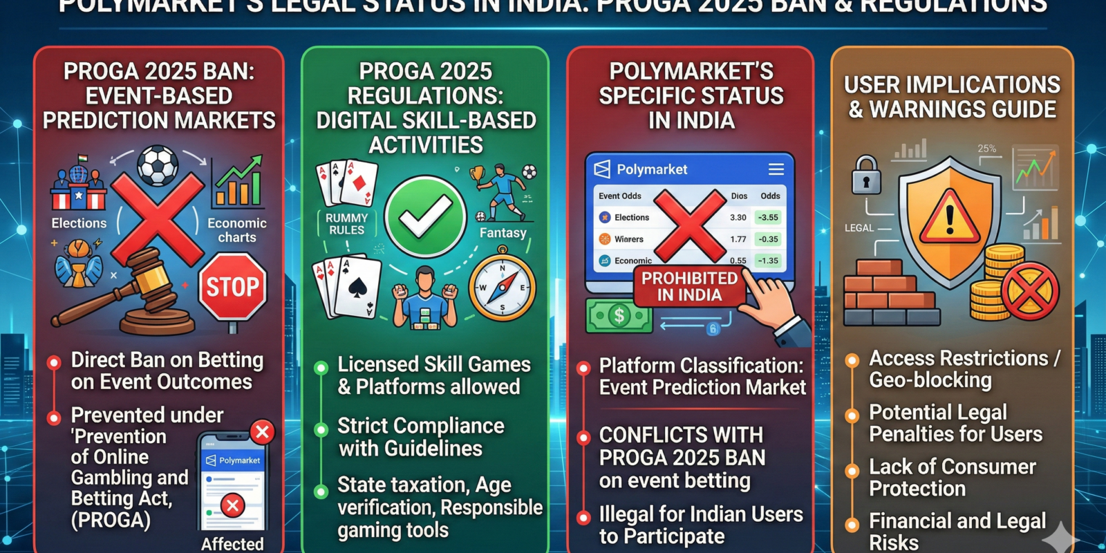 The legal status of Polymarket in India is clear. The Indian government passed the Promotion and Regulation of Online Gaming Act 2025 (PROGA). This act created a nationwide prohibition on all online money games. The law collapsed the old judicial distinction between games of skill and games of chance. It criminalizes any online platform where users stake money or its equivalent expecting a reward.